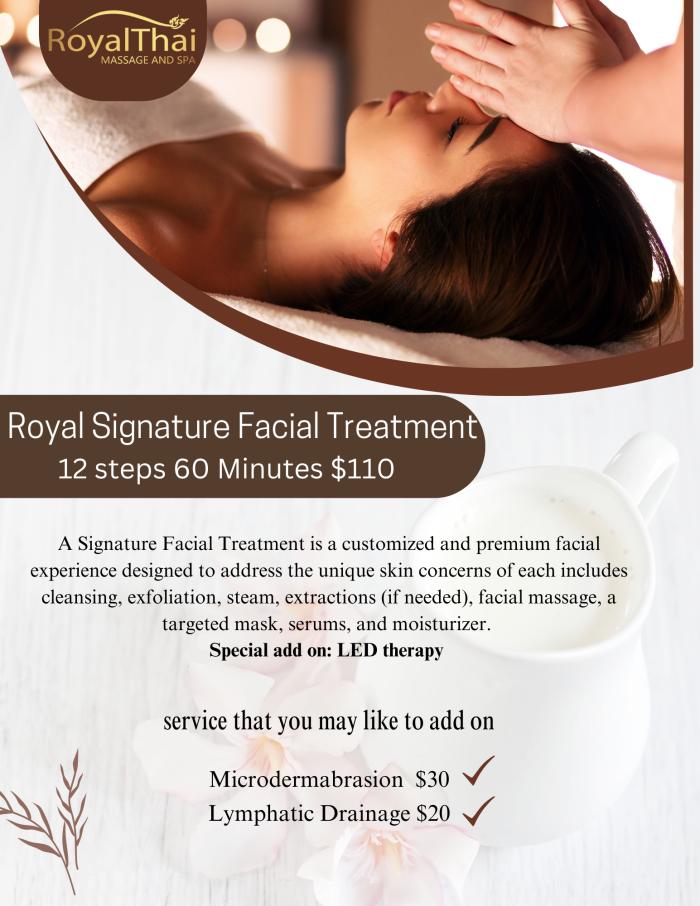 A Signature Facial Treatment is a customized and premium facial experience designed to address the unique skin concerns of each includes cleansing, exfoliation, steam, extractions (if needed), facial massage, a targeted mask, serums, and moisturizer.