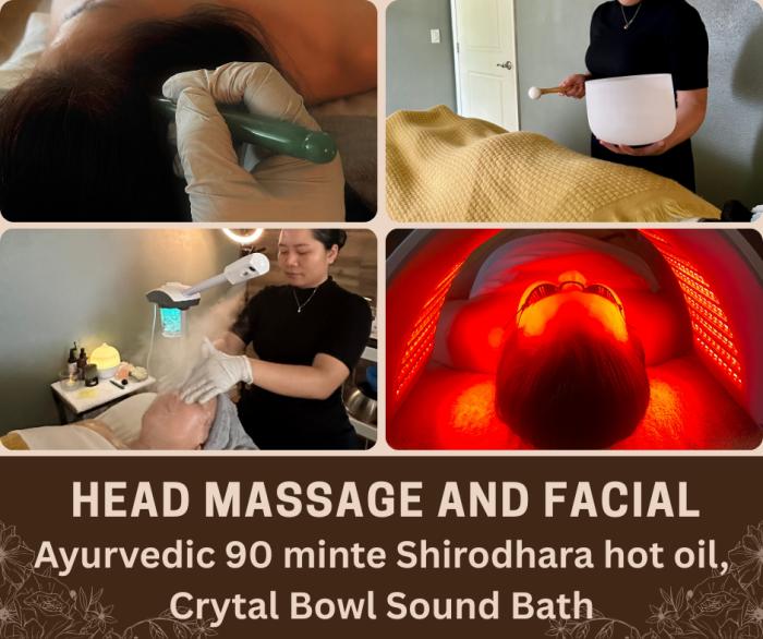 Ayurvedic 90 Minute Shirodhara hot oil Crystal Bowl Sound Bath Head Massage and Facial.