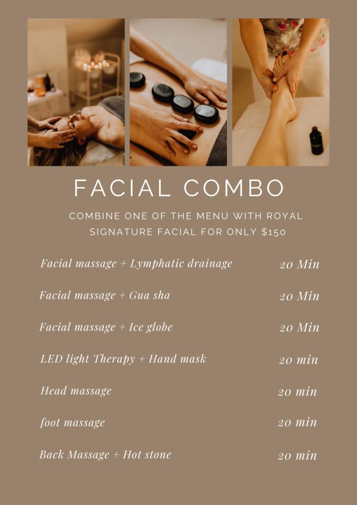 Indulge in the art of self-care with our Facial Combo Experience, thoughtfully curated to elevate your Royal Signature Facial. Each 20-minute enhancement is designed to restore balance, rejuvenate your skin, and soothe your senses.