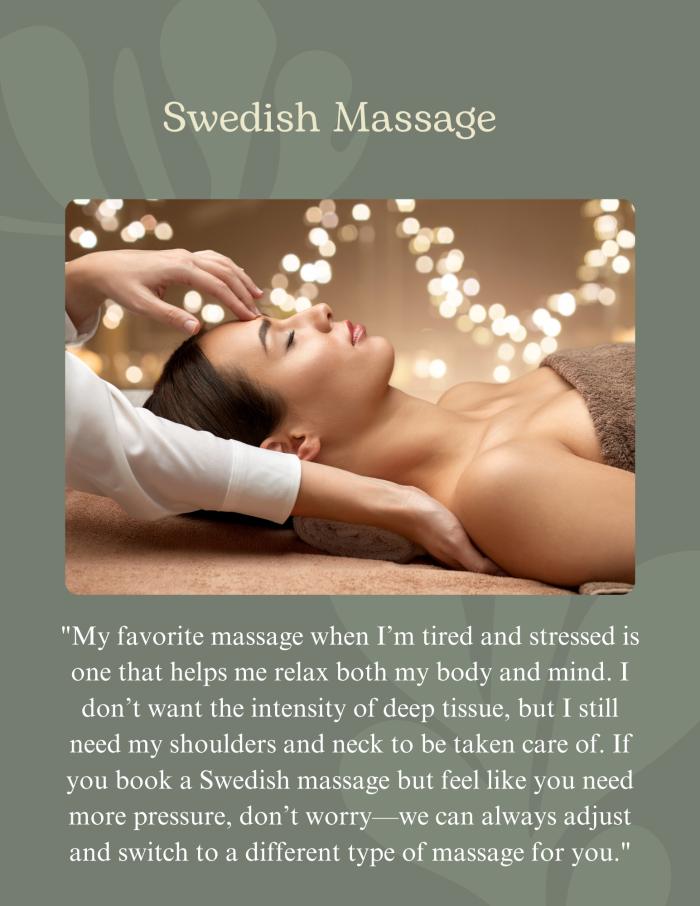 It is known for its ability to increase the oxygen flow in the blood and release toxins from the muscles. The main techniques used in Swedish massage is long flowing strokes full body oil massage, it improve circulation, and promote relaxation and for overall wellness. Swedish massage is also ideal for massage beginner, Swedish massage also suitable for who prefer a gentle massage or having stressand anxiety, Pressure we can adjust as you desired.