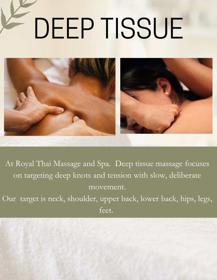 Deep Tissue designed to target and release deep layers of tension and muscle knots. Perfect for those with chronic pain, stress, or muscle stiffness, this specialized technique uses firm, focused pressure to improve circulation, enhance mobility, and promote overall healing. Let the stress melt away as your body feels revitalized, balanced, and strong again."