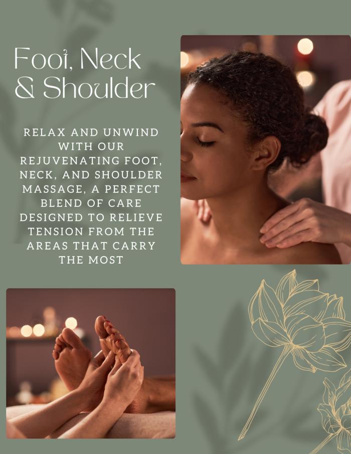 Relax and unwind with our rejuvenating foot, neck, and shoulder massage, a perfect blend of care designed to relieve tension from the areas that carry the most stress. This targeted treatment soothes tired feet, eases neck stiffness, and releases built-up tension in your shoulders, improving circulation and promoting deep relaxation. Feel refreshed and re-energized as your body finds balance and comfort in every step and movement.