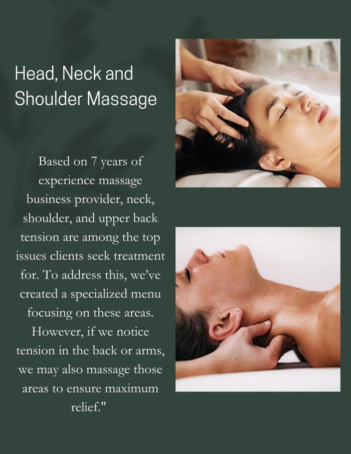 Experience the perfect combination of relaxation and relief with our head, neck, and shoulder massage options. Designed to target areas where stress and tension often build up, these treatments are perfect for relaxation and improved well-being.