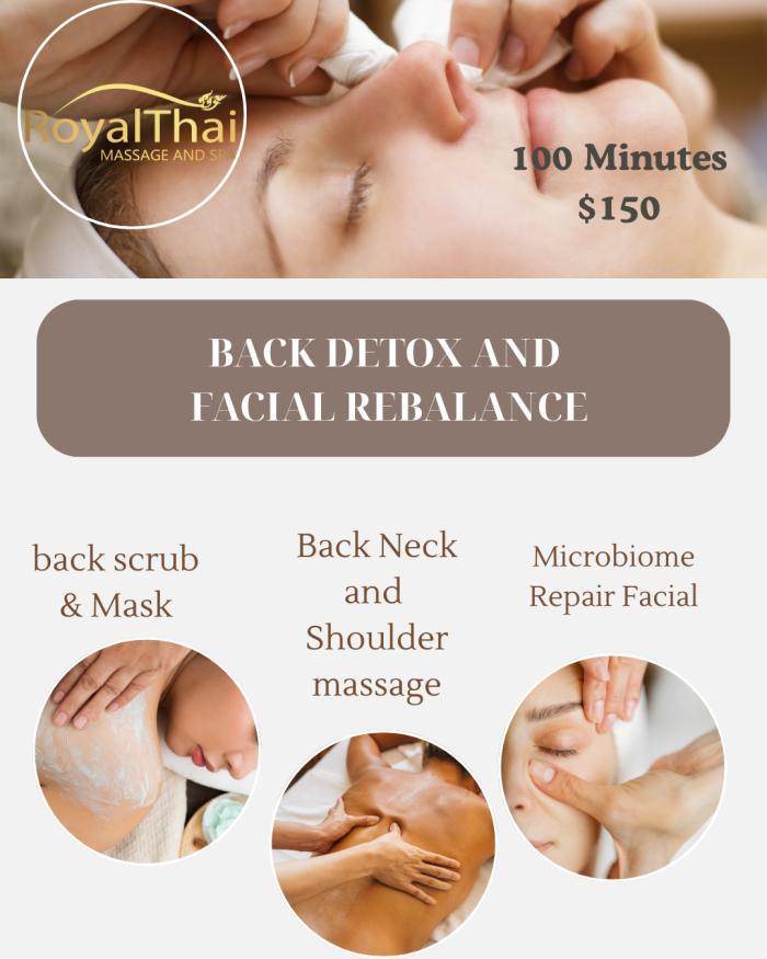 Your experience begins with a gentle back exfoliation scrub to remove impurities, dead skin cells. A deeply relaxing back, neck, and shoulder massage follows, melting away muscle tension while improving circulation and restoring comfort to the body. And enjoy the soothing and repairing effects this indulgent facial. This treatment is designed to effectively remove the keratin buildup on the skin to reduce bacteria and acne. The Pre & Post Biotic nourishing mask with Royal Tea rebalances the skin's microbiota, while improving barrier and immune function, hydrating, calming and nourishing the skin, leaving the skin balanced and restored to healthy glow.